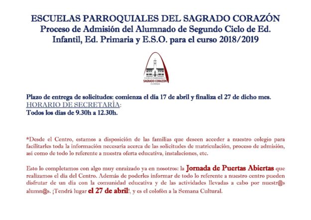 ESCUELAS PARROQUIALES DEL SAGRADO CORAZÓN Proceso de Admisión del Alumnado de Segundo Ciclo de Ed. Infantil, Ed. Primaria y E.S.O. para el curso 2018/2019 Plazo de entrega de solicitudes: comienza el día 17 de abril y finaliza el 27 de dicho mes. HORARIO DE SECRETARÍA: Todos los días de 9.30h a 12.30h. …