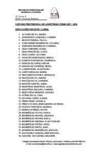 LISTADO PROVISIONAL ADMITIDOS INFANTIL CURSO 2017 – 2018