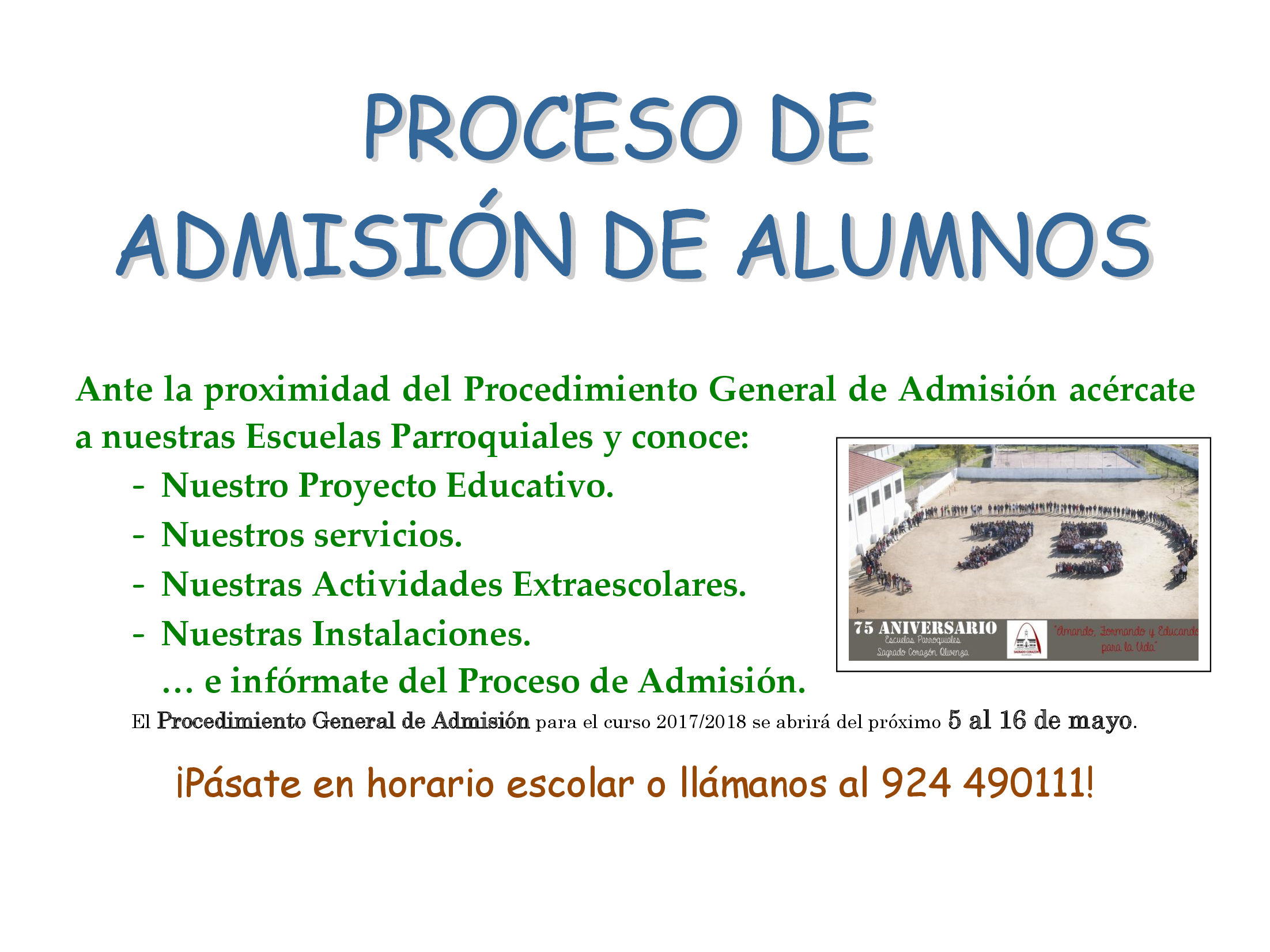 PROCESO DE ADMISIÓN DE ALUMNOS Ante la próximidad del Procedimiento General de Admisión, acércate a nuestras escuelas parroquiales y conoce: – Nuestro proyecto educativo</br> – Nuestros servicios</br> – Nuestras actividades extraescolares</br> – Nuestras instalaciones</br> … e informaté del Proceso de Admisión. El Procedimiento General de Admisión para el curso 2017/2018 se abrirá del próximo 5…
